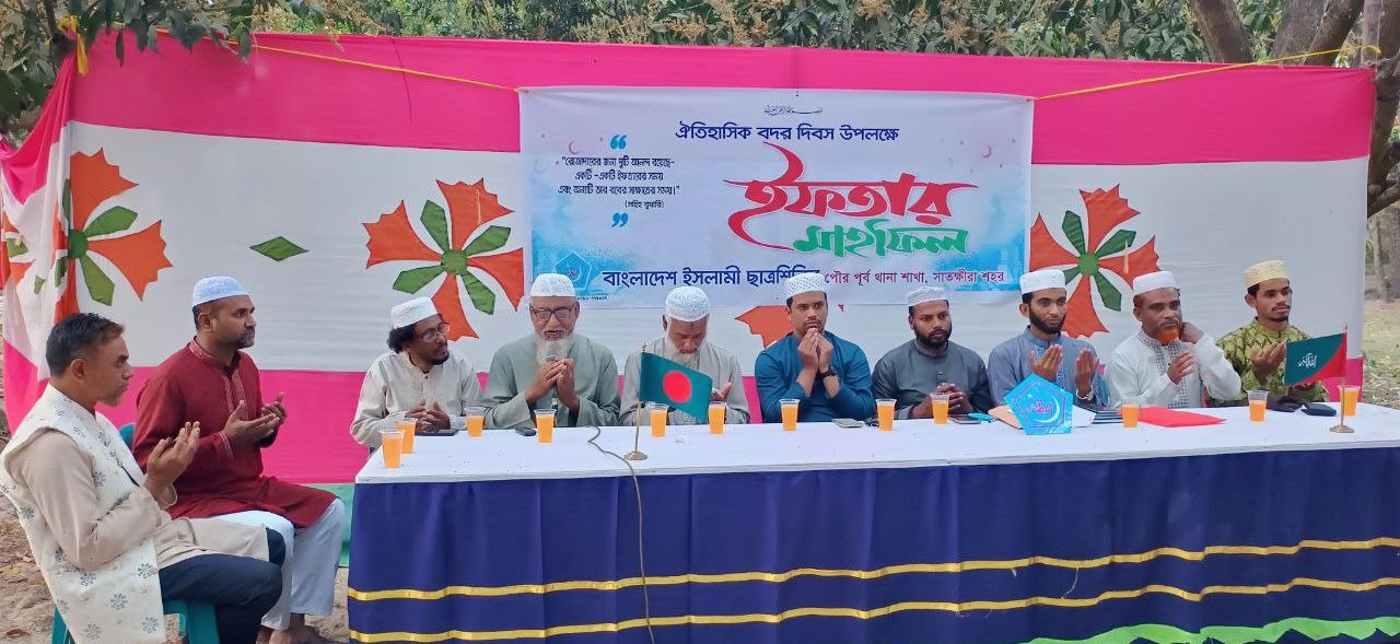 বাংলাদেশ ইসলামী ছাত্রশিবির সাতক্ষীরা শহর শাখার পৌর পূর্ব থানা শাখার উদ্যো গে ১৭ রমজান বদর দিবস উপলক্ষে আলোচনা সভা ও ইফতার মাহফিল অনুষ্ঠিত হয়েছে। শুক্রবার (৬ মার্চ) বিকাল ৫ টায় পুরাতন সাতক্ষীরার আলিয়া মাদ্রাসা পাড়ার আম বাগানে পৌর পূর্ব থানা সভাপতি জুবায়ের আহমেদ এর সভাপতিত্বে এবং সাংগঠনিক সম্পাদক রাকিবুল ইসলাম এর সঞ্চালনায় এ আলোচনা সভা ও ইফতার মাহফিল অনুষ্ঠিত হয়। অনুষ্ঠানে প্রধান অতিথি হিসেবে উপস্থিত ছিলেন বাংলাদেশ ইসলামী ছাত্রশিবিরের সাতক্ষীরা শহর শাখার সভাপতি মেহেদী হাসান। অতিথি হিসেবে উপস্থিত ছিলেন সাতক্ষীরা আলিয়া কামিল মাদ্রাসার ভারপ্রাপ্ত অধ্যক্ষ ড. মুফতি আখতারুজ্জামান, সাতক্ষীরা শহর ছাত্র শিবিরের শিক্ষা ও ভর্তি কোচিং কার্যক্রম সম্পাদক আল রাজীব, তথ্য ও মিডিয়া সম্পাদক মোঃ মাসুদ রানা, সাতক্ষীরা পৌর ৩ নম্বর ওয়ার্ড জামায়াতের আমির মোঃ ইব্রাহিম খলিল, রিসেন্ট সংস্থার পরিচালক মোঃ আবু জাফর, শ্রমিক কল্যাণ ফেডারেশনের সাতক্ষীরা শহর শাখার সহ-সভাপতি কামরুল ইসলাম, সাবেক পৌরপূর্ব থানা সভাপতি এড. আব্দুর রাজ্জাক ও মাস্টার মফিজুল ইসলাম। প্রধান অতিথি মেহেদী হাসান বলেন, বদর দিবস ইসলামের ইতিহাসে এক অবিস্মরণীয় দিন। এই দিনে মাত্র ৩১৩ জন সাহাবি ঈমানের শক্তি, ধৈর্য এবং আল্লাহর উপর অগাধ বিশ্বাস নিয়ে বৃহৎ শক্তির বিরুদ্ধে বিজয় অর্জন করেছিলেন। এই ঘটনা আমাদের শেখায়-সংখ্যা নয়, বরং সত্যের উপর অবিচল থাকা এবং আল্লাহর উপর পূর্ণ ভরসাই প্রকৃত শক্তি। ইফতার মাহফিলে দোয়া ও মোনাজাত পরিচালনা করেন ড. মুফতি আক্তারুজ্জামান